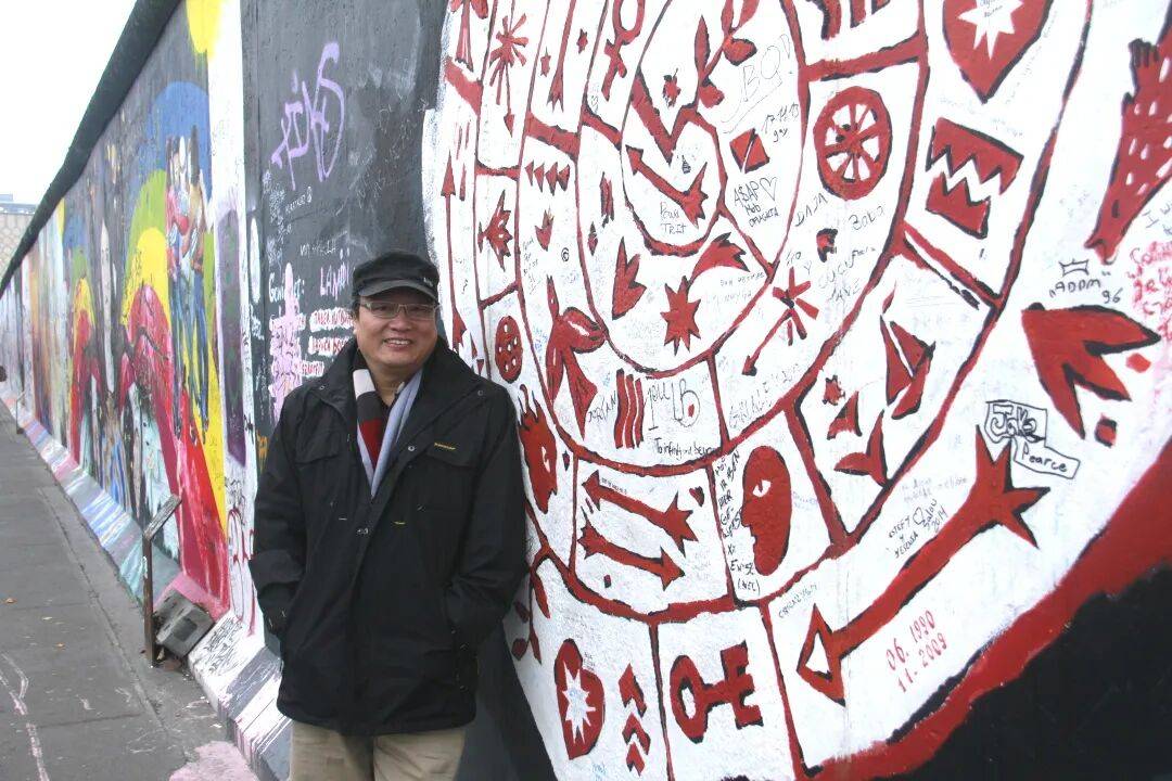 马乐:这个图片墙,是我这几年在世界各地的一些剪影留影。你看中间这幅照片,这是当时的新华社社长蔡名照,我有幸陪蔡社长一同前往希腊、意大利、日本。这张照片中是希腊总统,当时是向希腊总统赠送了一份礼物——我们的《太行靠山图》。
