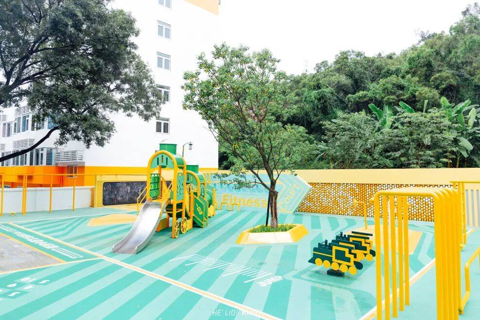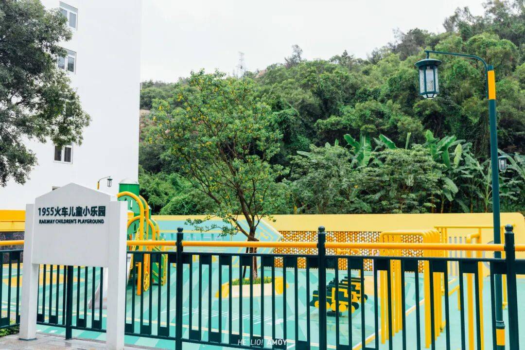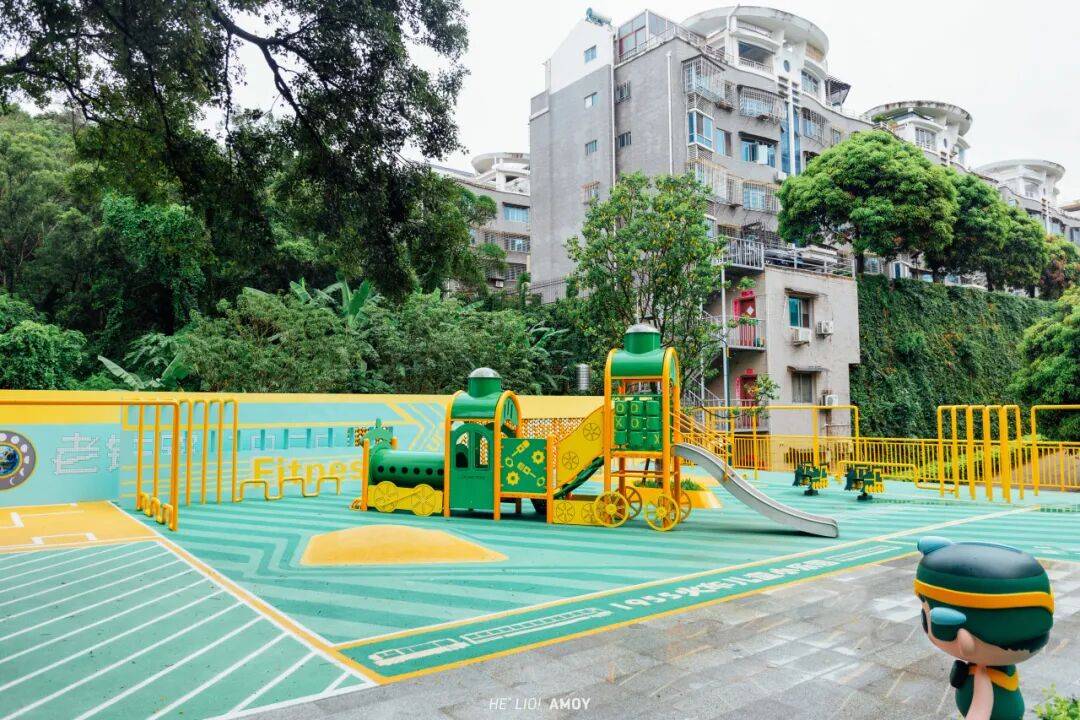 以绿皮火车为原型的滑梯、摇摇车,黄、绿色为主色调,整体充满生机和童趣,十分醒目。
