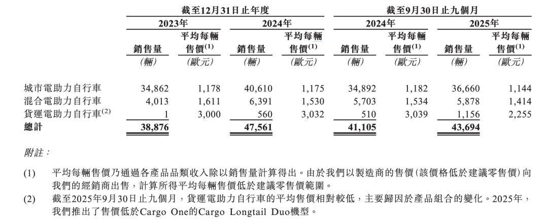 2023年、2024年以及2025年前三季度,公司的电助力自行车销售量分别为38876辆、47561辆、43694辆。这意味着在2025年仅前九个月,其销量就已接近2023年全年水平,增长势头可见一斑。