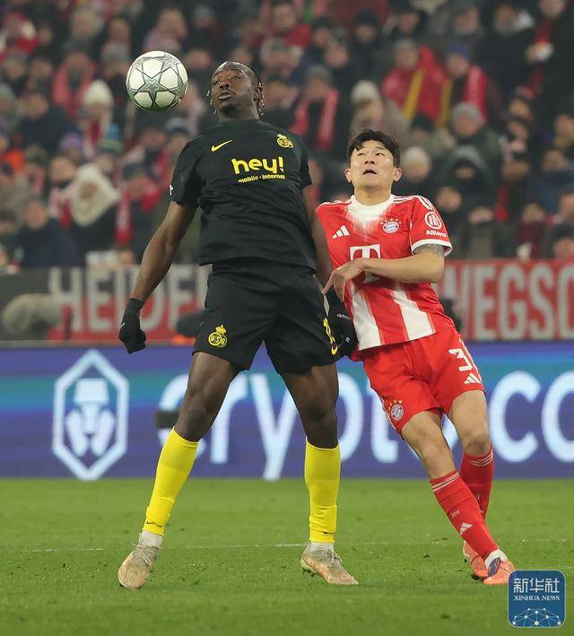 ↑ 拜仁慕尼黑队球员金玟哉(右)和圣吉罗斯联合队球员达维德在比赛中拼抢。