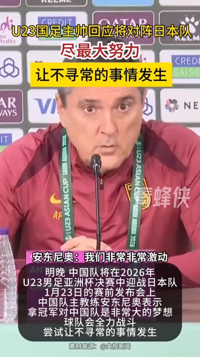 在23日的赛前发布会上,中国队主教练安东尼奥表示,拿冠军对中国队是非常大的梦想,球队会全力战斗,“我们的心态非常棒,球员们对自己有信心,在足球比赛里,相信自己是很重要的。”他说,“我们知道日本队整体实力很强,不仅仅在亚洲,他们在世界足坛层面也是如此,这就是现实情况。我们会尽最大努力,肯定会全力战斗。足球世界很现实,但有时候也会发生非凡的事情。我们会去尝试,让不寻常的事情发生。”