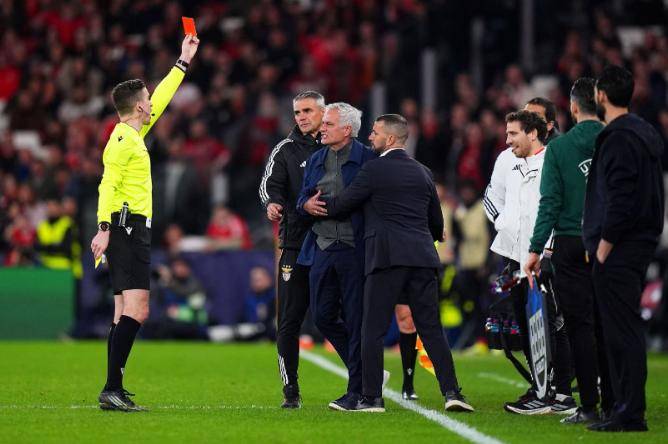 在备受瞩目的焦点战,皇马凭借维尼修斯的世界波,1-0客场复仇本菲卡,但比赛最大的焦点却是场边——63岁的主帅穆里尼奥因为暴怒抗议,被红牌直接罚下了场。