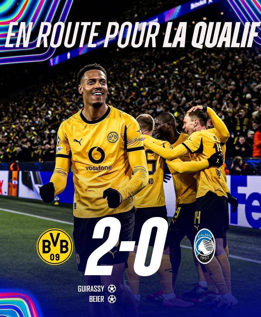 在另一场同时进行的比赛中,德甲的多特蒙德在主场2-0战胜了意甲的亚特兰大“真蓝黑”。