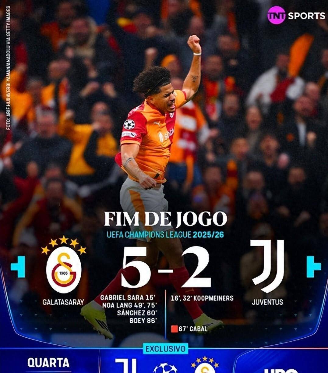 人数占优的加拉塔萨雷彻底放开了手脚。 第74分钟,诺阿·朗接到队友传球后获得单刀机会,他冷静推射完成梅开二度,将比分扩大为4-2。 比赛最后时刻,第86分钟,博埃在禁区右侧小角度抽射破门,将最终的比分锁定在了5-2。