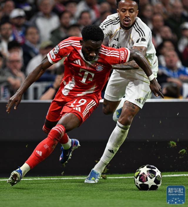 ↑ 拜仁慕尼黑队球员阿方索·戴维斯(左)与皇家马德里队球员米利唐在比赛中拼抢。